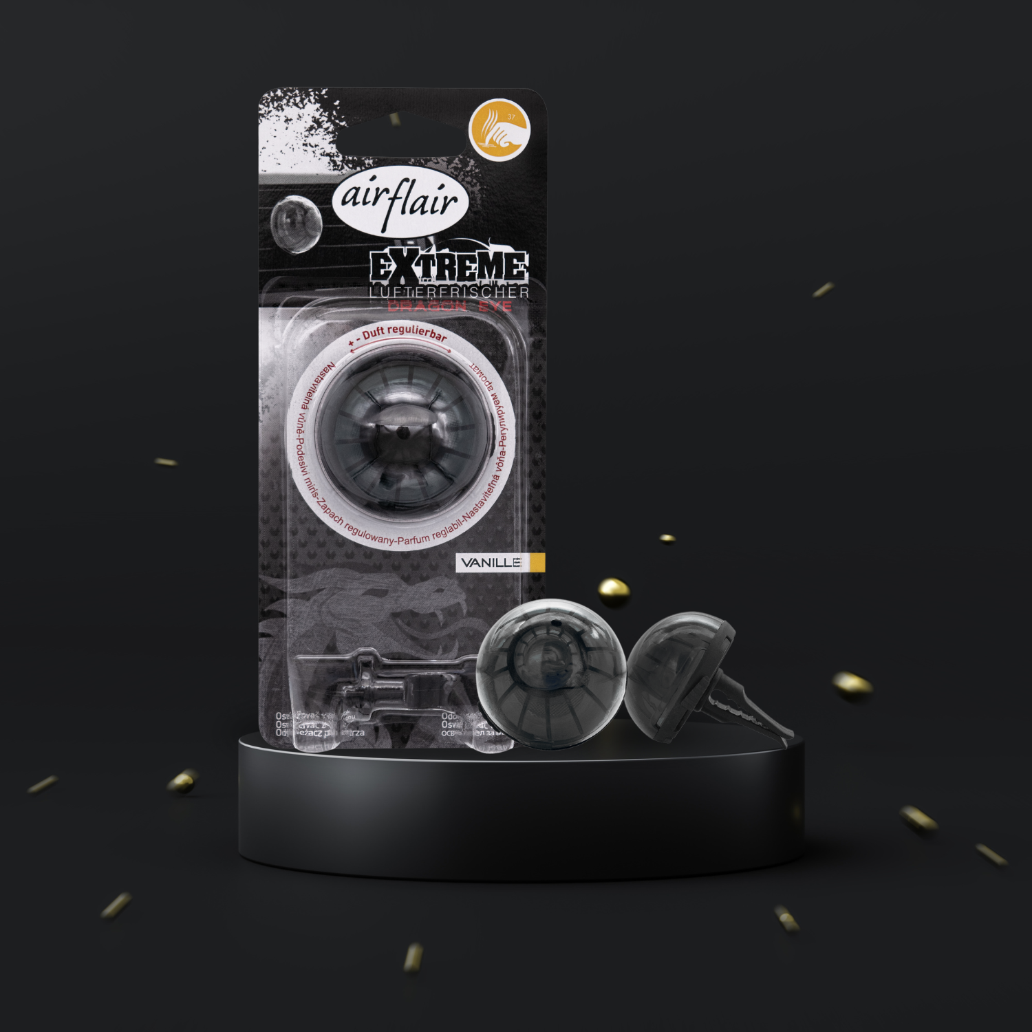 Das tief schwarze Design, das an das mystische Auge eines Drachens erinnert, integriert sich nahtlos in das Innere deines Wagens und wird schnell zum beeindruckenden Highlight an deinem Lüftungsgitter. Wenn das Mysteriöse auf die Wärme von Vanille trifft, erhält jede Autofahrt eine unverwechselbare Tiefe und Eleganz. Entdecke die perfekte Symbiose aus atemberaubendem Design und verführerischem Duft mit dem 'Extreme' Dragon Eye Lufterfrischer.