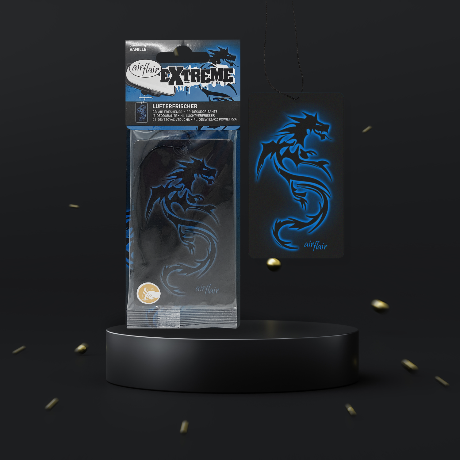 Steige ein in ein automobile Duftdimension mit dem airflair 'Extreme' Papierlufterfrischer im unverkennbaren Drachen-Design. Einzigartig in seiner Erscheinung und mit der sinnlichen Note von Vanille, ist dieser Lufterfrischer mehr als nur ein Accessoire für den Rückspiegel deines Autos.